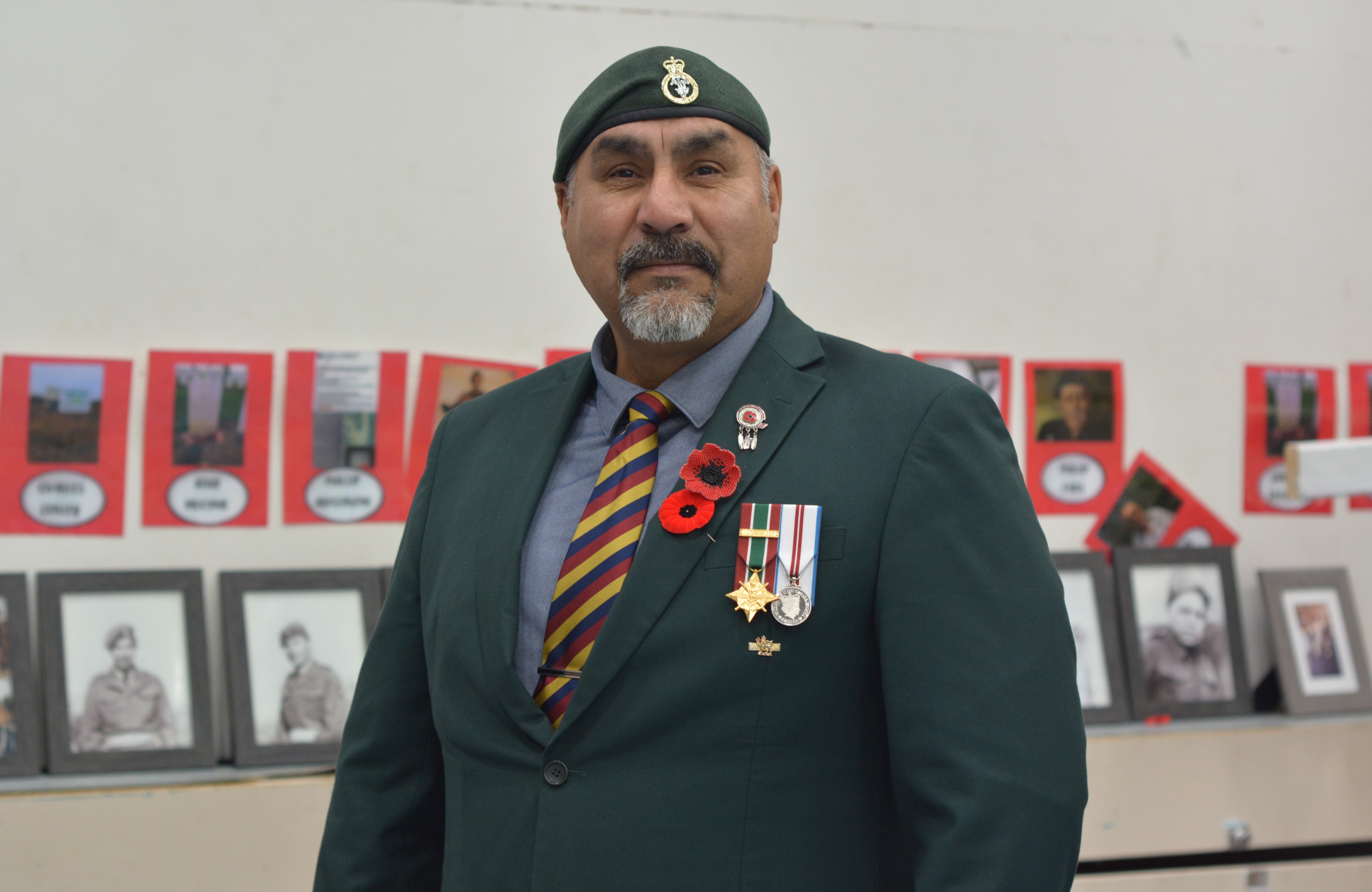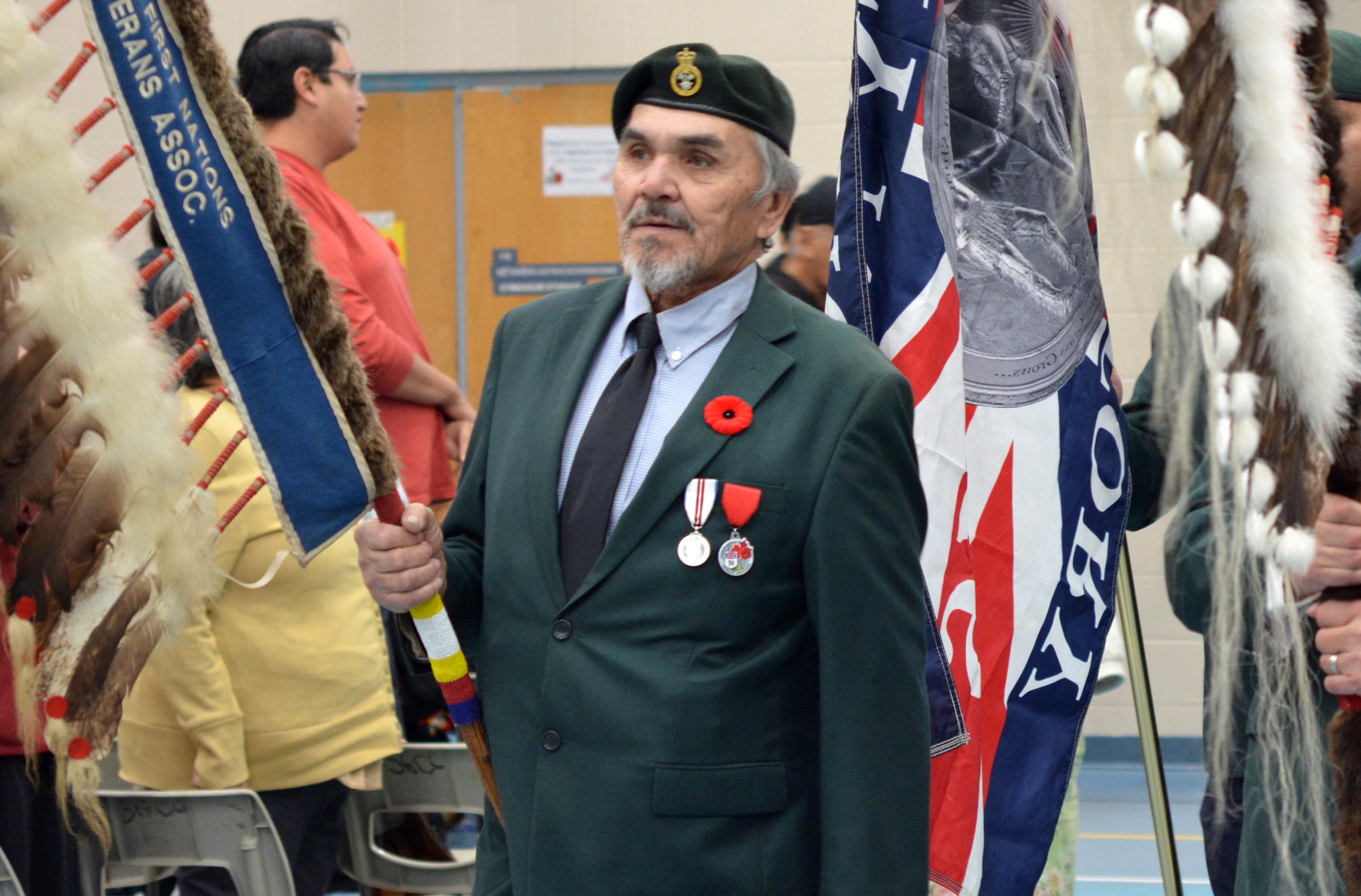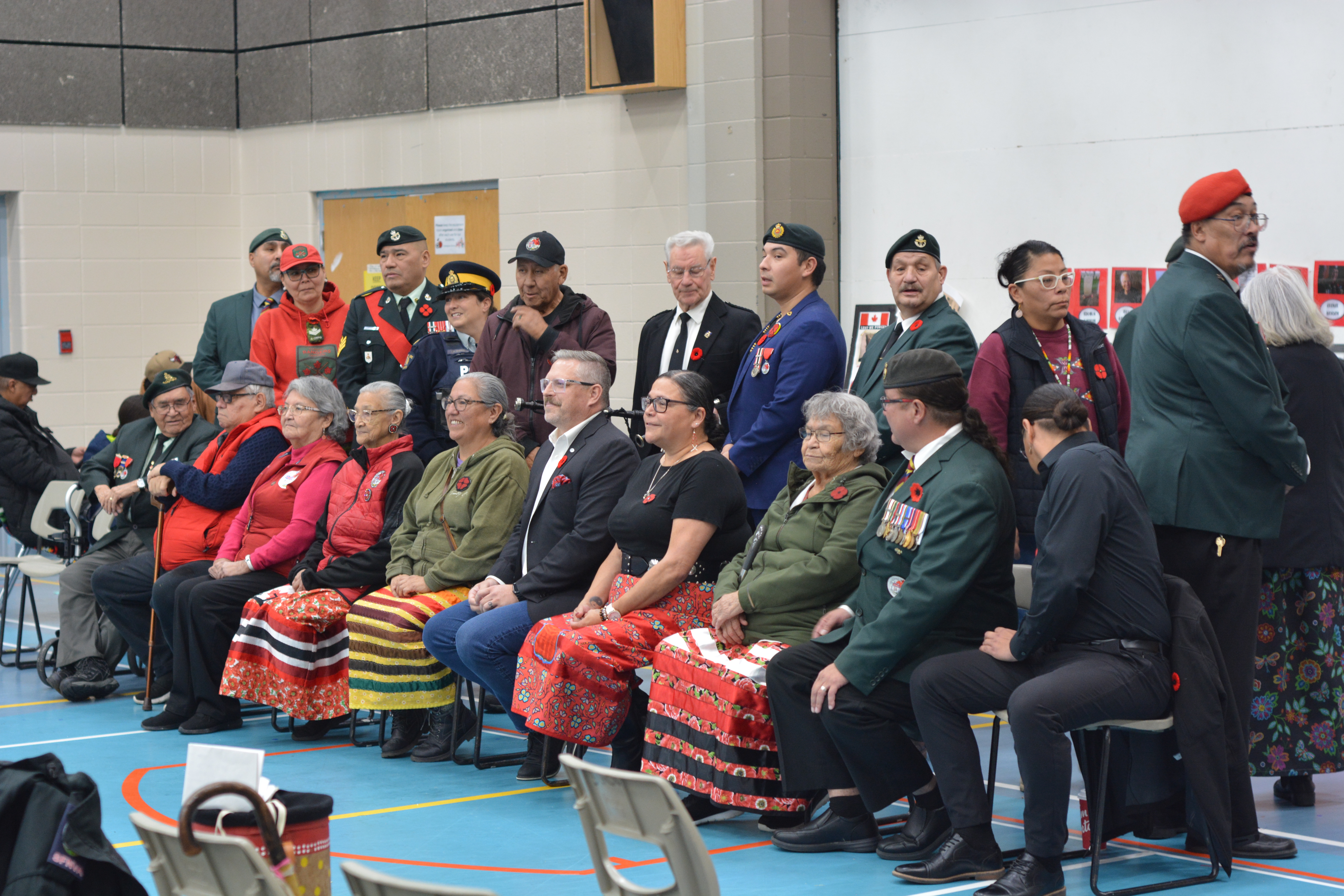 The low hum of drums and the cry of bagpipes drifted through the community hall at Sweetgrass First Nation on Nov. 10 as veterans in berets and medals rose to their feet.