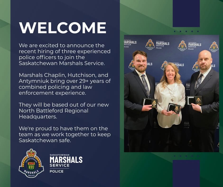 The agency announced Tuesday that Marshals Chaplin, Hutchison and Antymniuk bring “over 29+ years of combined policing and law enforcement experience,” and will be based out of the Battlefords regional office as the service builds out its second operating hub in the province, alongside the existing provincial headquarters in Prince Albert.