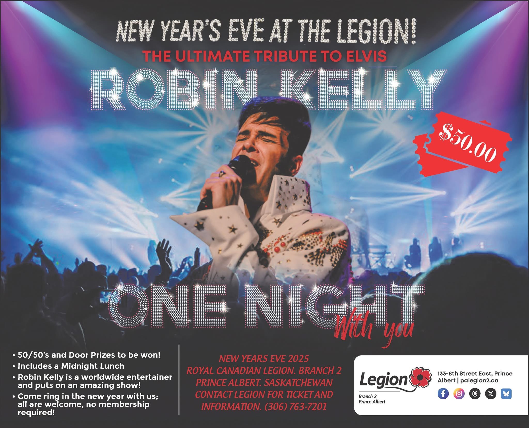 The Royal Canadian Legion Branch #2 is hosting New Year’s Eve with The Ultimate Tribute to Elvis with Robin Kelly.