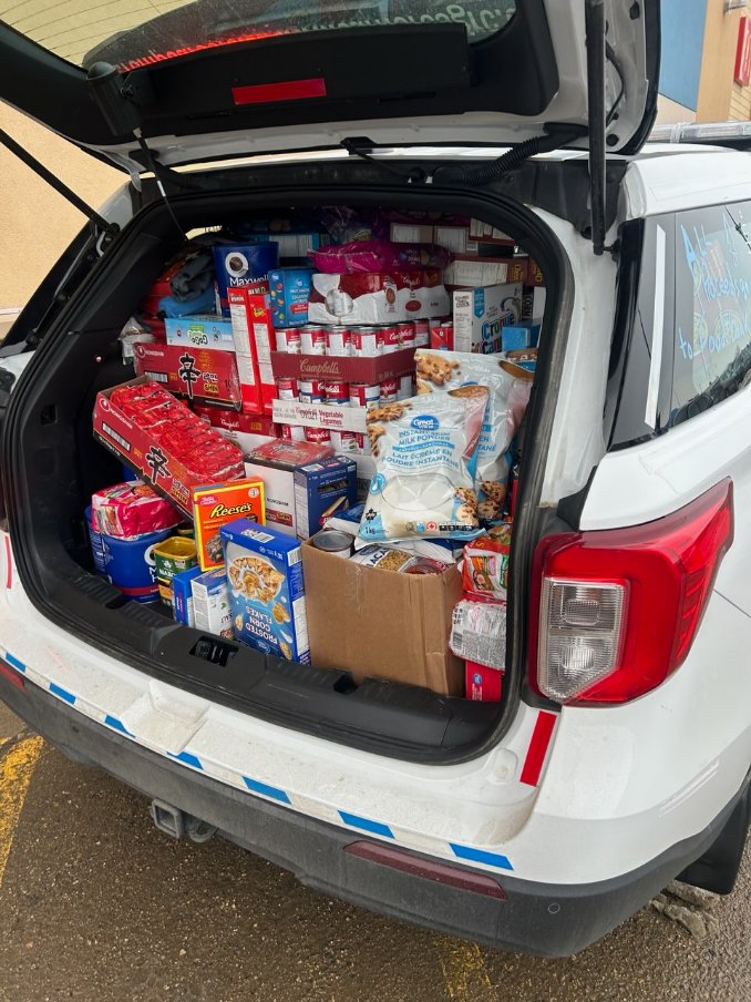 The donations raised from Saturday’s Fill the Cruiser event once again brought smiles to the RCMP members’ faces as their detachment’s boardroom is now stuffed from the 3,340 pounds of food, and over $14,600 in monetary offerings for the Battlefords District Food and Resource Centre.