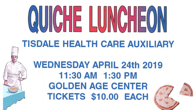 The Tisdale Health Care Auxiliary will be Wednesday, April 24 from 11:30 a.m. until 1:30 p.m. at the Golden Age Center.Tickets are $10.00.
