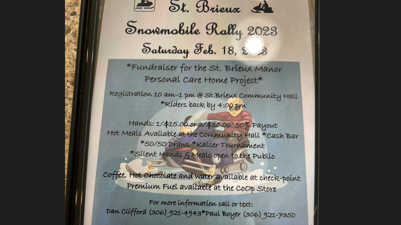 The St. Brieux Snowmobile Rally will be February 18th with proceeds going to the St. Brieux Manor Personal Care Home.See the poster for details.