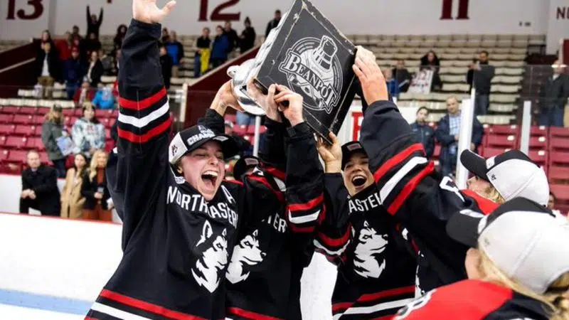 May 06, 2020 Prince Albert's Brooke Hobson lifts the Beanpot with her teammates. (Twitter/Northeastern University Huskies)