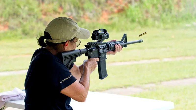 May 01, 2020 A woman shooting an AR-15 rifle at a shooting range. (ID 149964740 © Flphotogirl | Dreamstime.com)