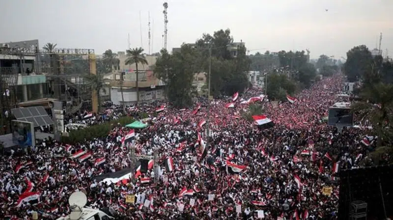 BAGHDAD - Waving national flags and banners denouncing U.S. President Donald Trump, tens of thousands of Iraqis marched peacefully through Baghdad on Friday to demand the ouster of U.S. troops from th...