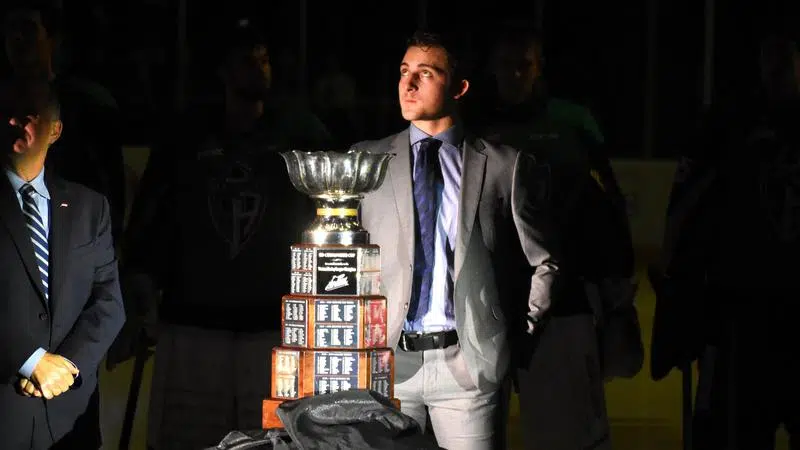 Sep 21, 2019 Brayden Pachal with the Ed Chynoweth Cup during the pre-game ceremonies for Friday’s Raider season opener at the Art Hauser Centre. (Jeff D’Andrea/paNOW Staff)