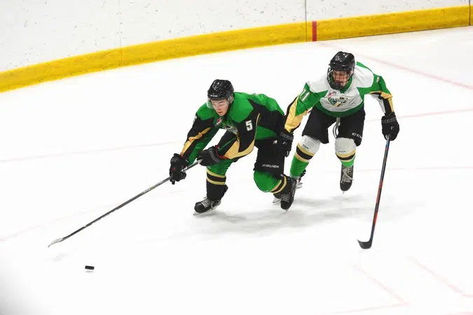 Sep 02, 2019 Defenceman Landon Kosior (green) protects the puck from Devin Jameson during the Green and White game at the Art Hauser Centre. (Jeff D'Andrea/paNOW Staff)