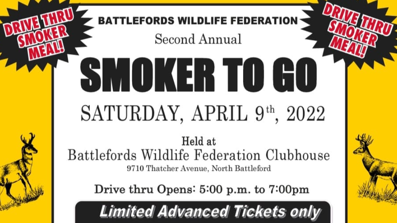 The Battlefords Wildlife Federation is hosting its Second Annual Smoker to Go on Saturday, April 9 at the clubhouse.See the poster for details.