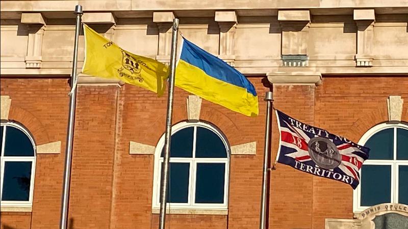 The Town of Battleford is also now flying the vivid blue and yellow Ukrainian flag outside its municipal building. This follows the City of North Battleford raising it's own Ukrainian flag last week. ...