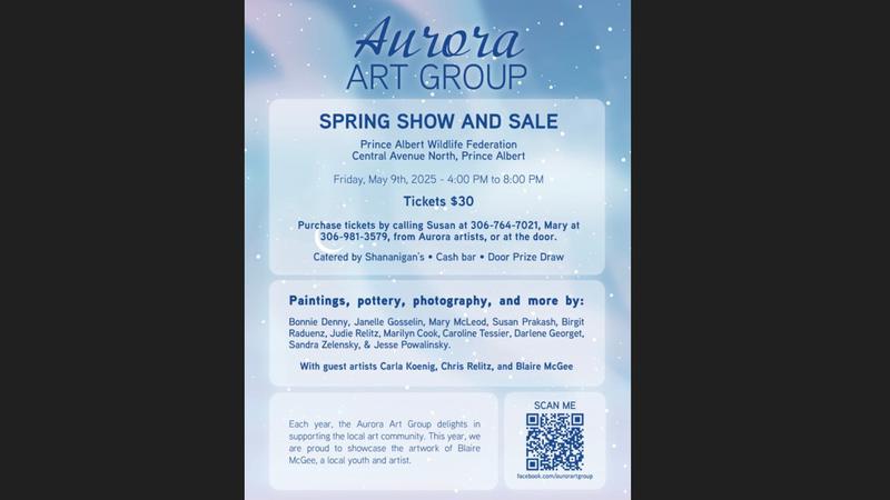 The Aurora Art Group will have their Spring Show and Sale May 9 at the Prince Albert Wildlife Federation.See the poster below for details.