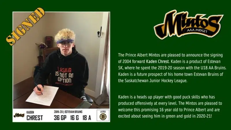 May 07, 2020 Kaden Chrest signs with the Mintos. Twitter/Prince Albert Mintos