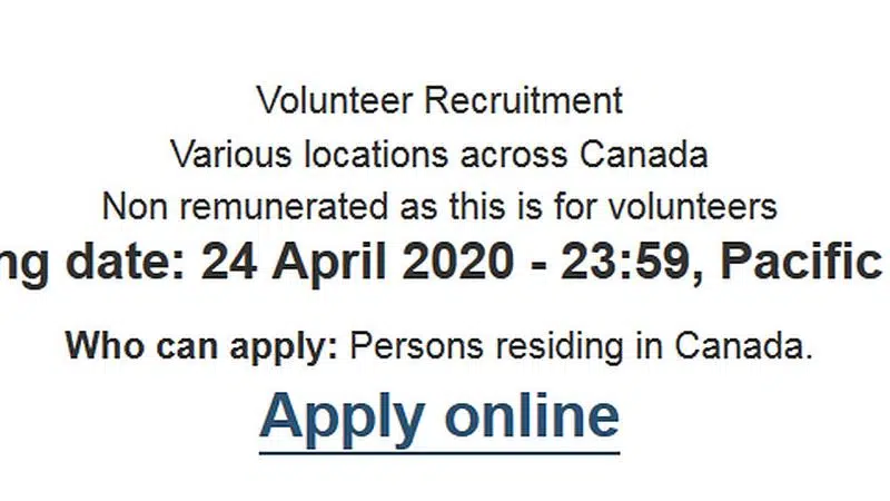 Closing date: 24 April 2020 - 23:59, Pacific Time Who can apply: Persons residing in Canada. Apply onlineImportant messages National COVID-19 Volunteer Recruitment Campaign - We need you! The Governme...