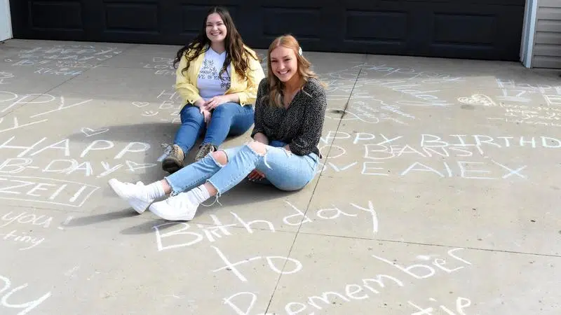 Mar 30, 2020 Sarah (left) and Bria Szell (right) pose on their family's driveway surrounded by birthday messages for Bria. (Alison Sandstrom/paNOW Staff)