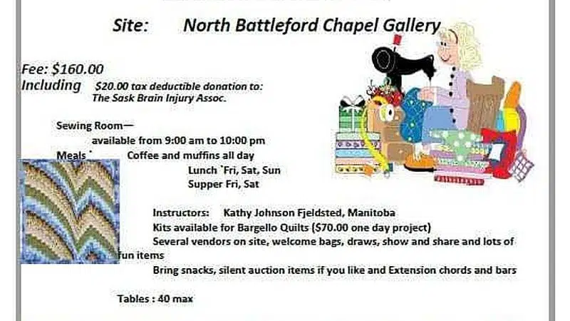 The Saskatchewan Royal Purple's Brain Love Quilt Retreat will be March 27 - 29 at the Chapel Gallery in North Battleford.Fee is $160.