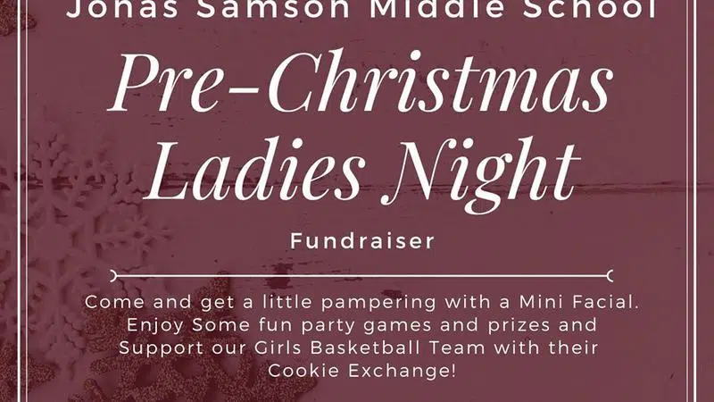 Jonas Samson Middle School is hosting a Pre-Christmas Ladies Night Fundraiser November 27.See the poster for details.
