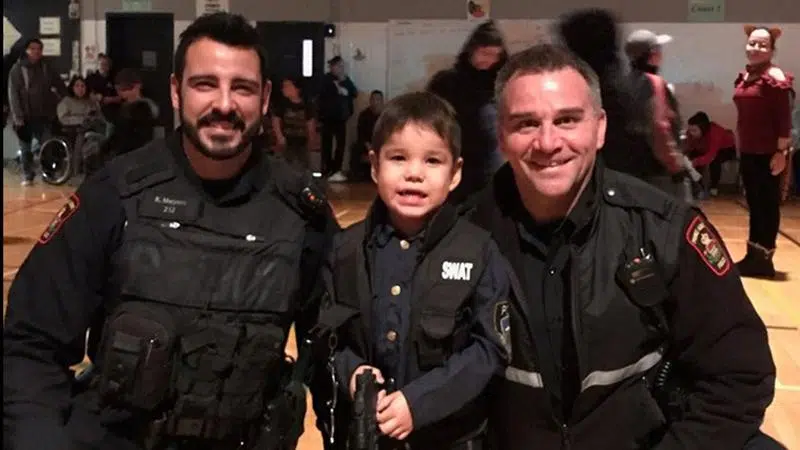 Oct 30, 2019 Cst. Ron Meyers (left) and Cst. Derek Simonson posing with a student at the Riverside School's Halloween Dance. (Submitted Photo/ Prince Albert Police Service Facebook page)