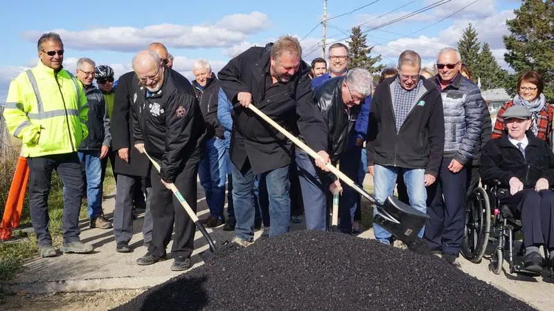 Oct 10, 2019 Mayor Greg Dionne (left), Dave Fischl (centre) and Coun. Don Cody (right) use shovels to spread asphalt onto the last meter of the Rotary Trail. (Alison Sandstrom/paNOW Staff)