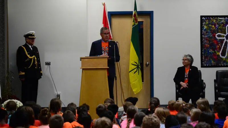 Sep 30, 2019 Lt.-Gov. Russ Mirasty spoke to kids at École Holy Cross Monday morning. (Michael Joel-Hansen/paNOW Staff)
