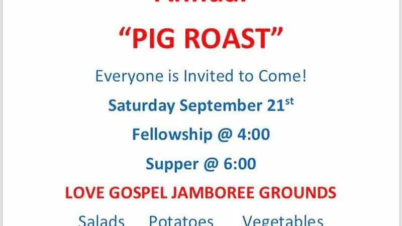 The Annual Love Gospel Jamboree Pig Roast will be Saturday, Septeber 21 at the Love Gospel Jamboree Grounds.See the poster for details.