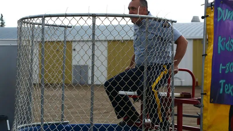 Aug 15, 2019 Darcy Woolfitt, of the Battlefords RCMP, volunteers to be dunked in a tank of water to support the cause. (Martin Martinson/battlefordsNOW Staff)