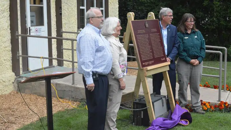 Aug 16, 2019 Mayor Greg Dionne, Connie Gerwing, Dr. Bill Waiser and Christine Hamilton pose with the plaque (Michael Joel-Hansen/paNOW Staff)