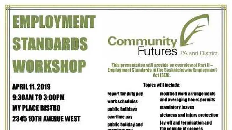Community Futures for Prince Albert and District is holding an Employment Standards Workshop on April 11 starting at 9:30 a.m. until 3:00 p.m. The cost is only $15.00 per person and lunch is included....