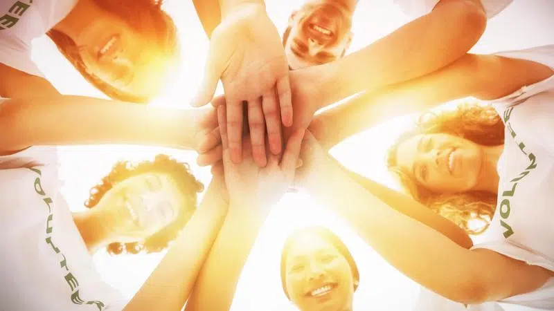 Mar 18, 2019 Cheerful group of volunteers putting hands together on white background