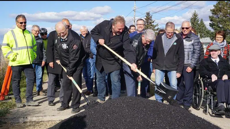 Dec 31, 2019 Mayor Greg Dionne (left), Dave Fischl (centre) and Coun. Don Cody (right) use shovels to spread asphalt onto the last meter of the Rotary Trail. (Alison Sandstrom/paNOW Staff)